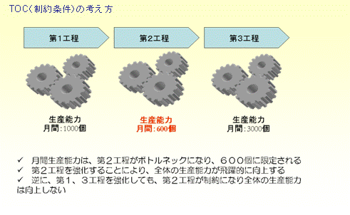 これを企業競争力の観点から見た場合に「営業」が制約になっており、営業次第で企業全体の成果が決まる。それは営業を通さない限り売上があがらないからであり、必ずすべての売上は営業を通るからである。つまり、営業の通り具合が悪ければそれはそのまま企業の成果を低下させ、逆に、その営業の通り具合を良くすることで、企業全体の成果は飛躍的に向上する。